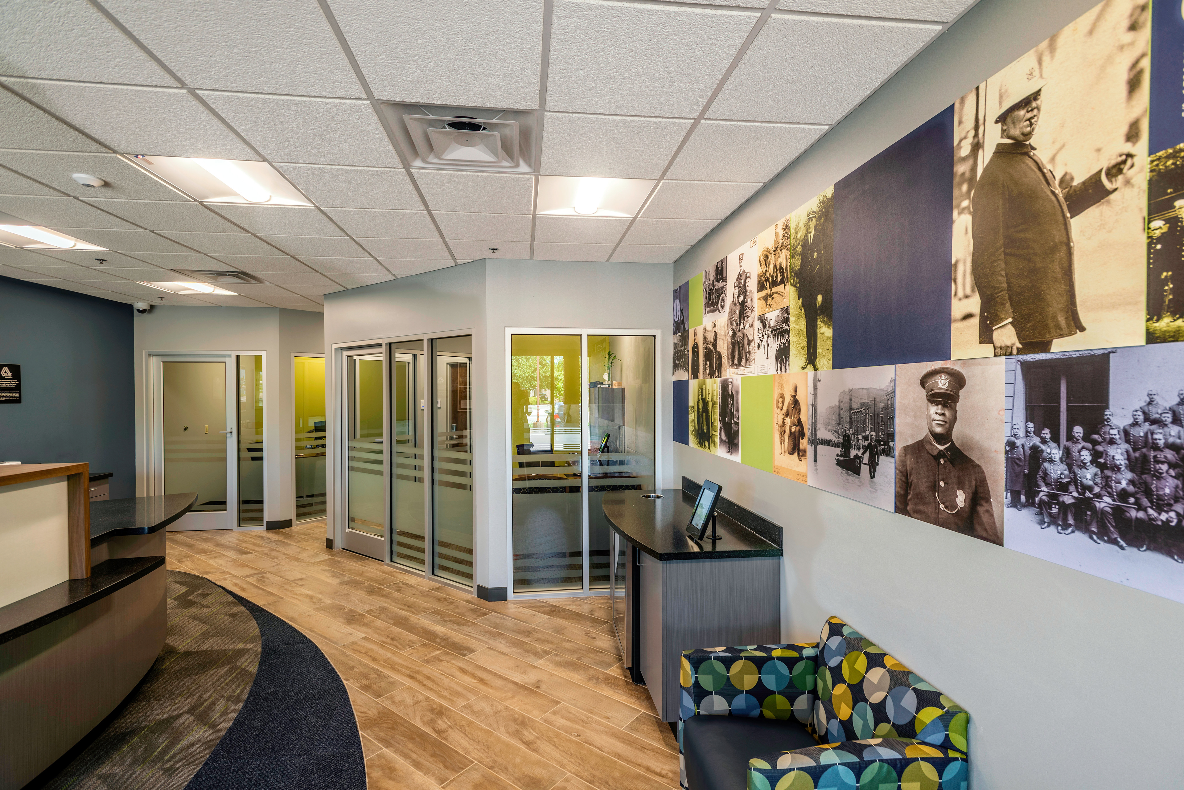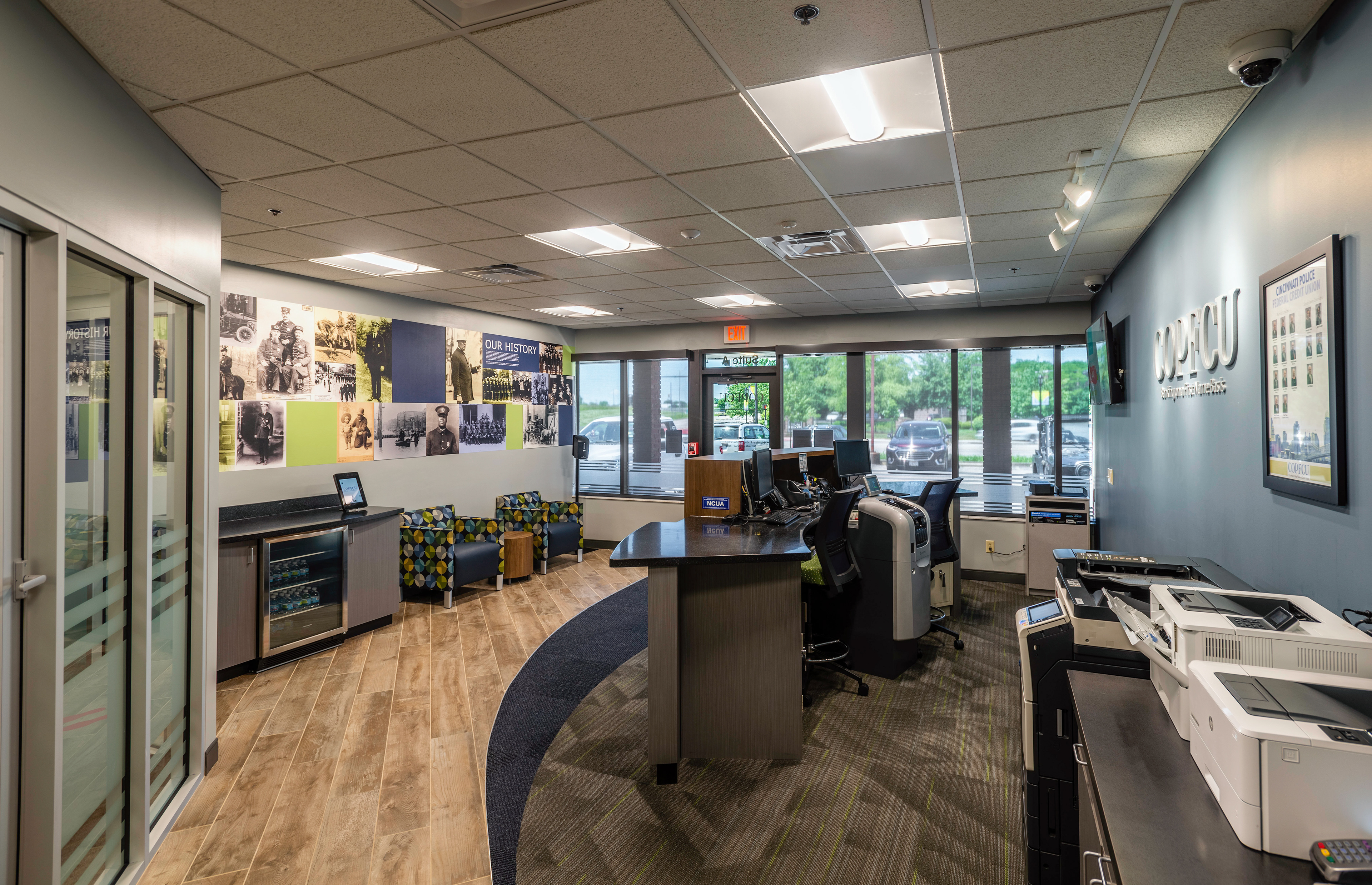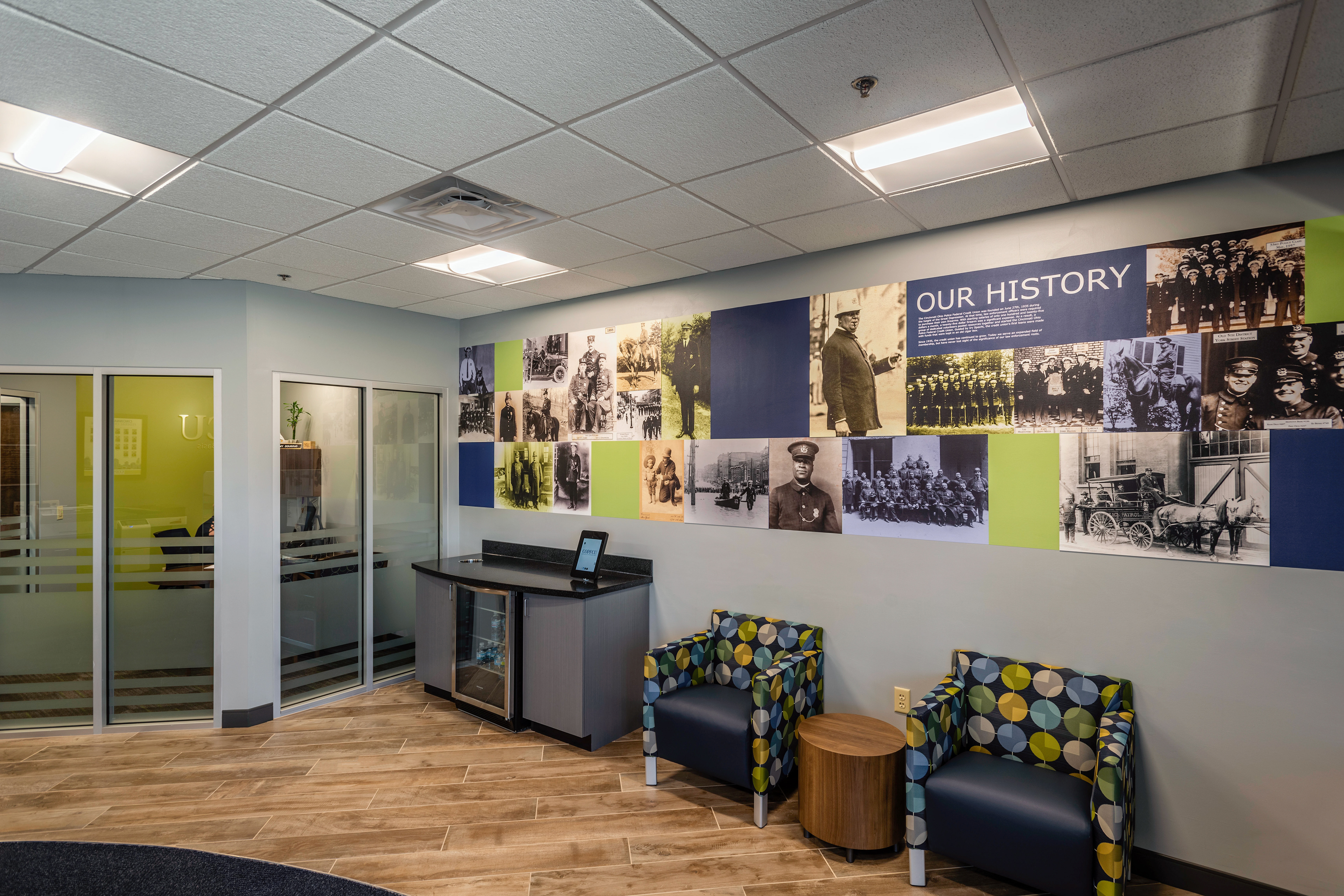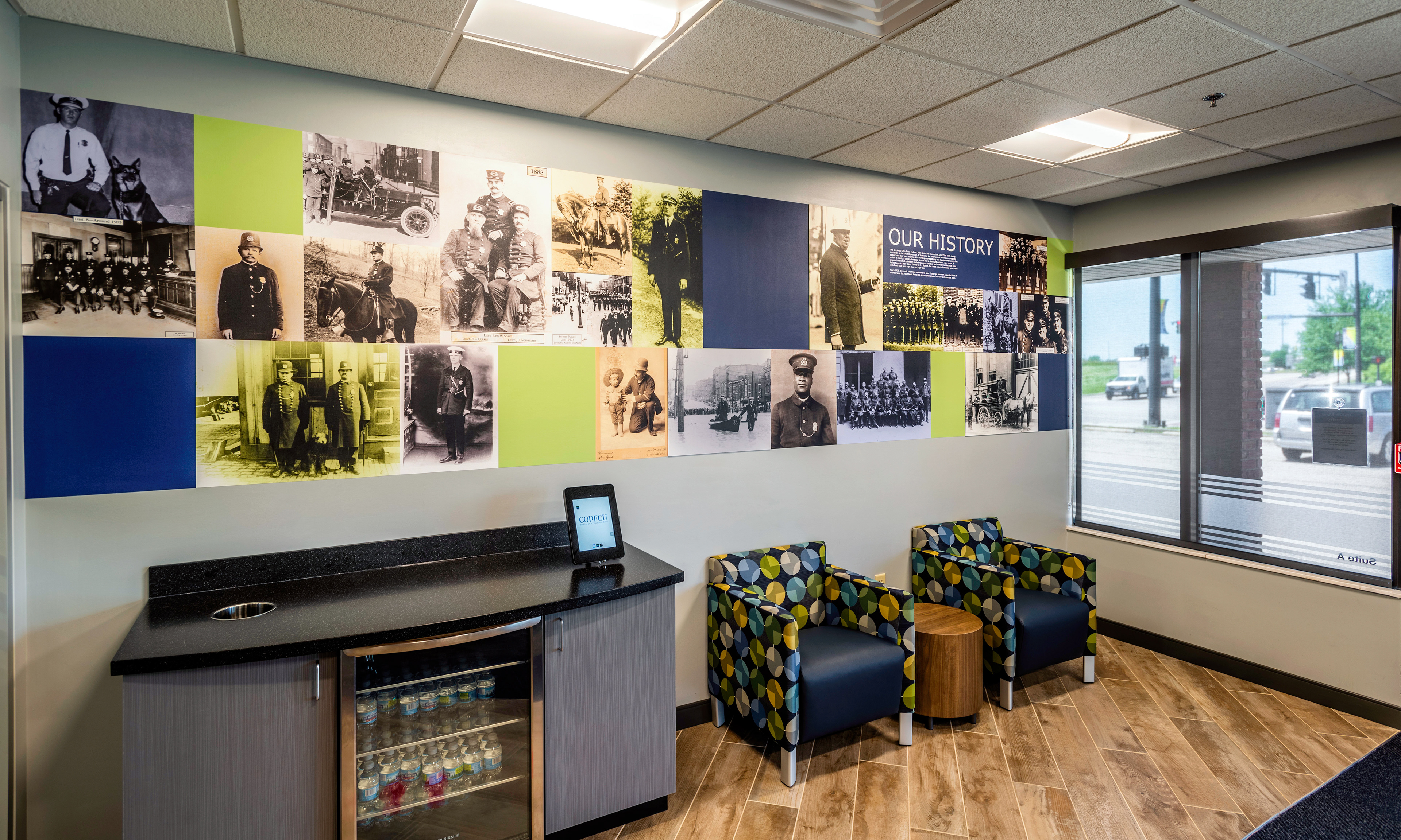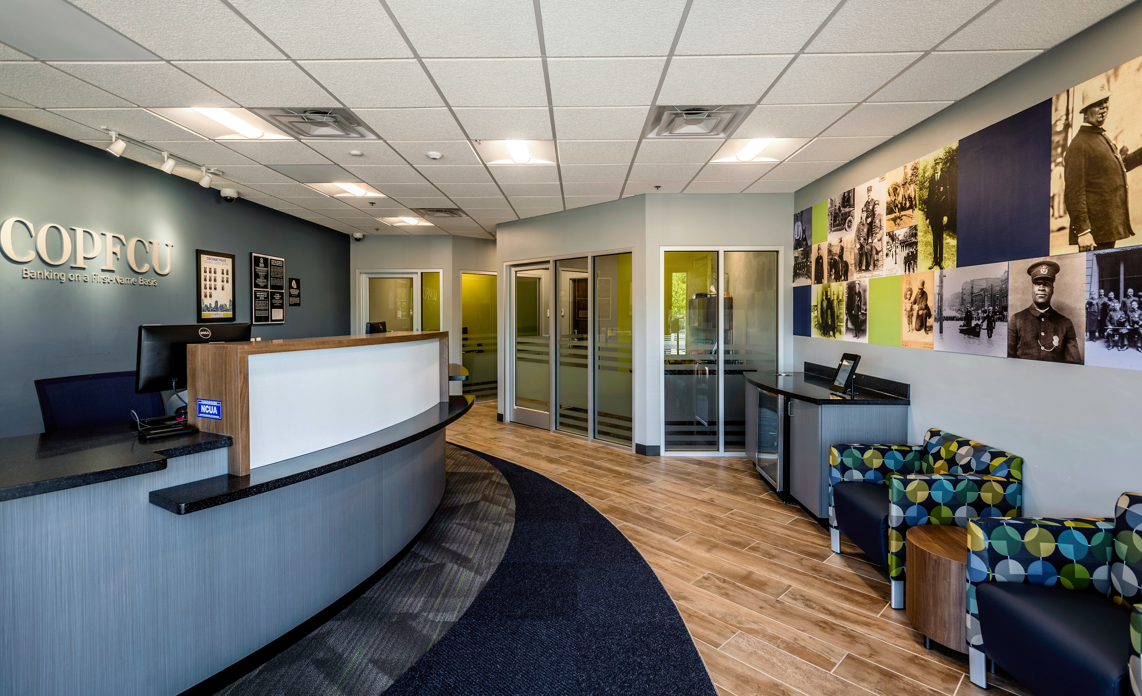 Environmental graphic design for the interior of the COP FCU- Cincinnati Order of Police Federal Credit Union branch. Installed by Harlan Graphic Arts Services Co. located in Cincinnati, OH.